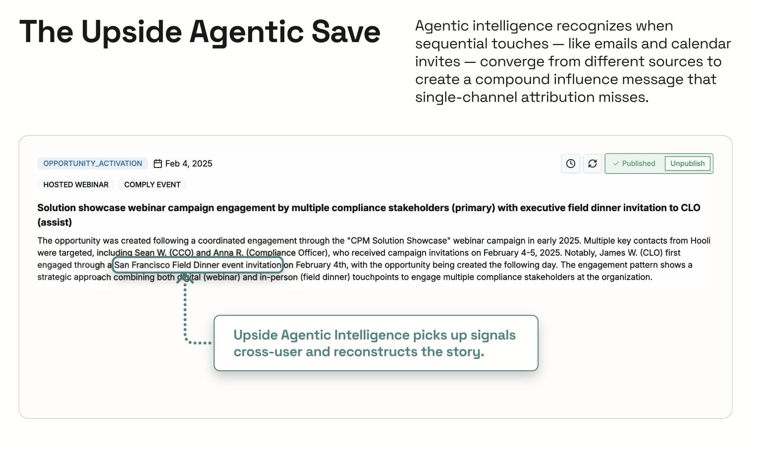 We also detect event mentions in Salesforce notes, emails, and call transcripts, the types of unstructured data that traditionally were impossible to analyze at an aggregate level. When an AE writes, “Met them at Dreamforce,” or a prospect references your dinner in a follow-up email, Upside extracts that signal and ties it directly to the opportunity. Suddenly, what was invisible becomes measurable evidence of influence.